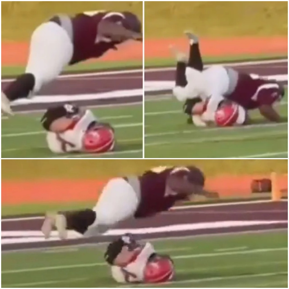 Then, the hulking player climbs off his opponent and launches his full body weight back on the curled-up teen — pancaking him.