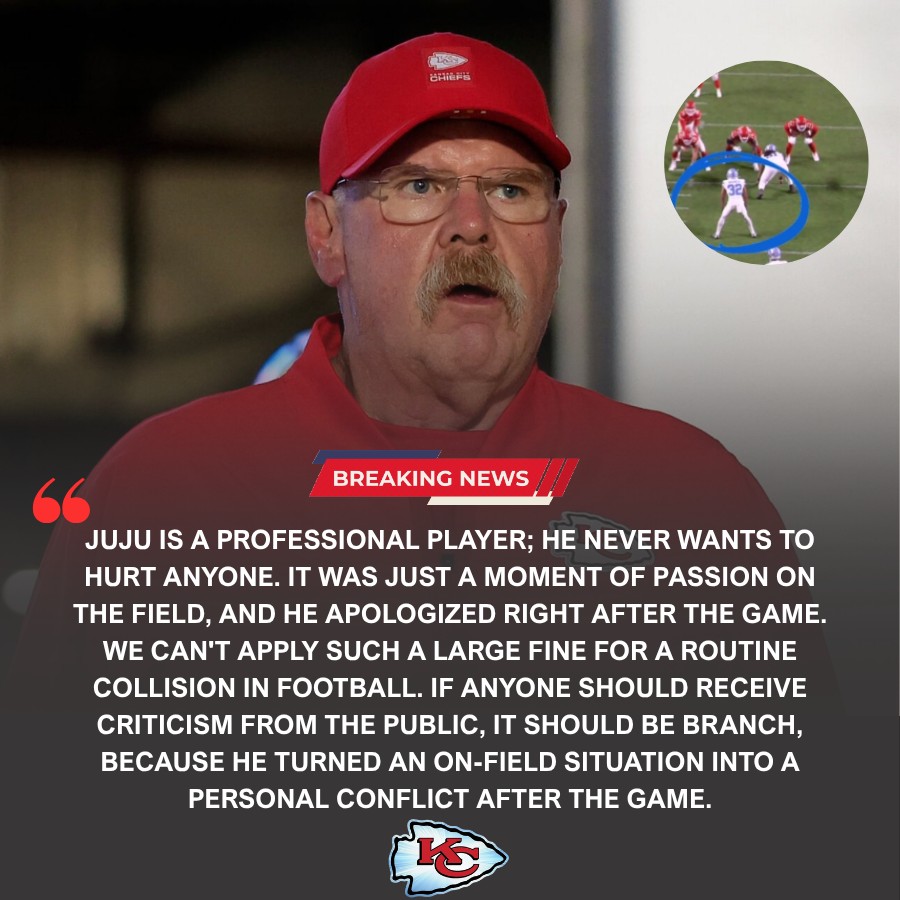 The Chiefs’ head coach, Andy Reid, quickly spoke out in defense of his player during a press conference after the fine was announced. Reid asserted that Smith-Schuster’s action was merely a “slip-up” and completely unintentional. “JuJu is a professional player; he never wants to hurt anyone. It was just a moment of passion on the field, and he apologized right after the game,” Reid said. He also expressed opposition to the $45,000 fine, arguing that it was excessively harsh given the nature of the incident. “We can’t apply such a large fine for a routine collision in football. If anyone should receive criticism from the public, it should be Branch, because he turned an on-field situation into a personal conflict after the game.”