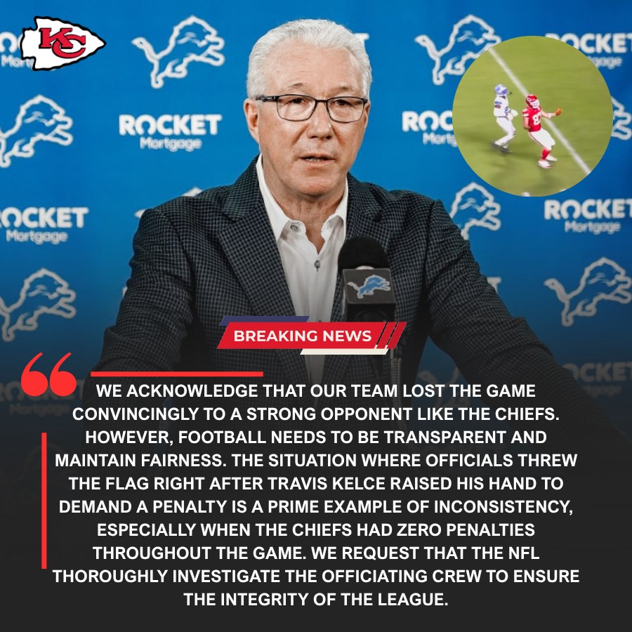 ST.Lions President Submits Complaint Requesting NFL Investigation of Officiating Crew After Flag Thrown Immediately Following Travis Kelce Raising His Hand to Demand a Penalty in Game Against Chiefs