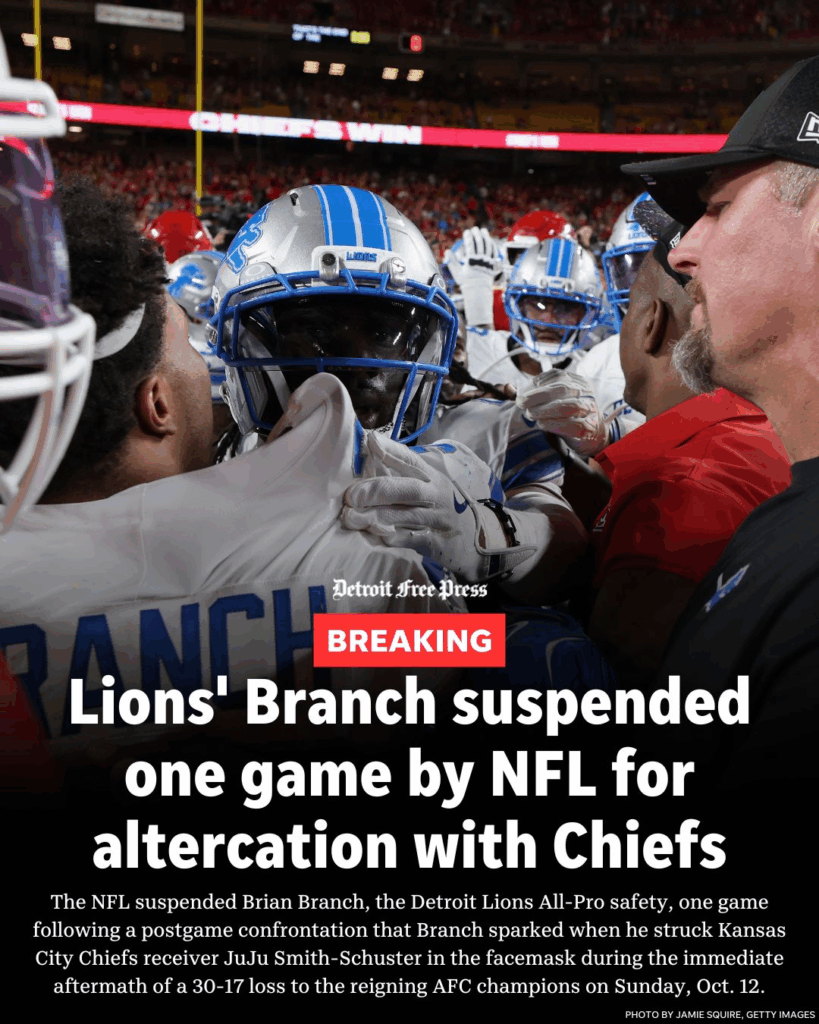 Detroit Lions defensive star Brian Branch will miss the crucial game against the NFC-leading Tampa Bay Buccaneers after being suspended for one game by the NFL following a shocking brawl with Chiefs’ JuJu Smith-Schuster. The decision leaves the Lions without a key cog in their lineup as they prepare to face a strong opponent on Monday Night Football. Fans are anxiously waiting to see if Branch is successful in his appeal and how his absence will impact the Lions’ performance.HEADLINE: Brian Branch Unable to Play in Monday Night’s Clash with Tampa Bay Buccaneers – Lions’ Great Guard Suspended After Shocking Brawl!