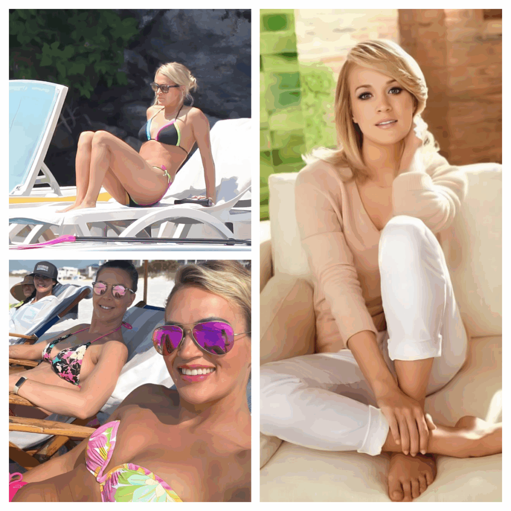 US.Carrie Underwood looks stunning as she shows off her hot body on the beach with a strange man.