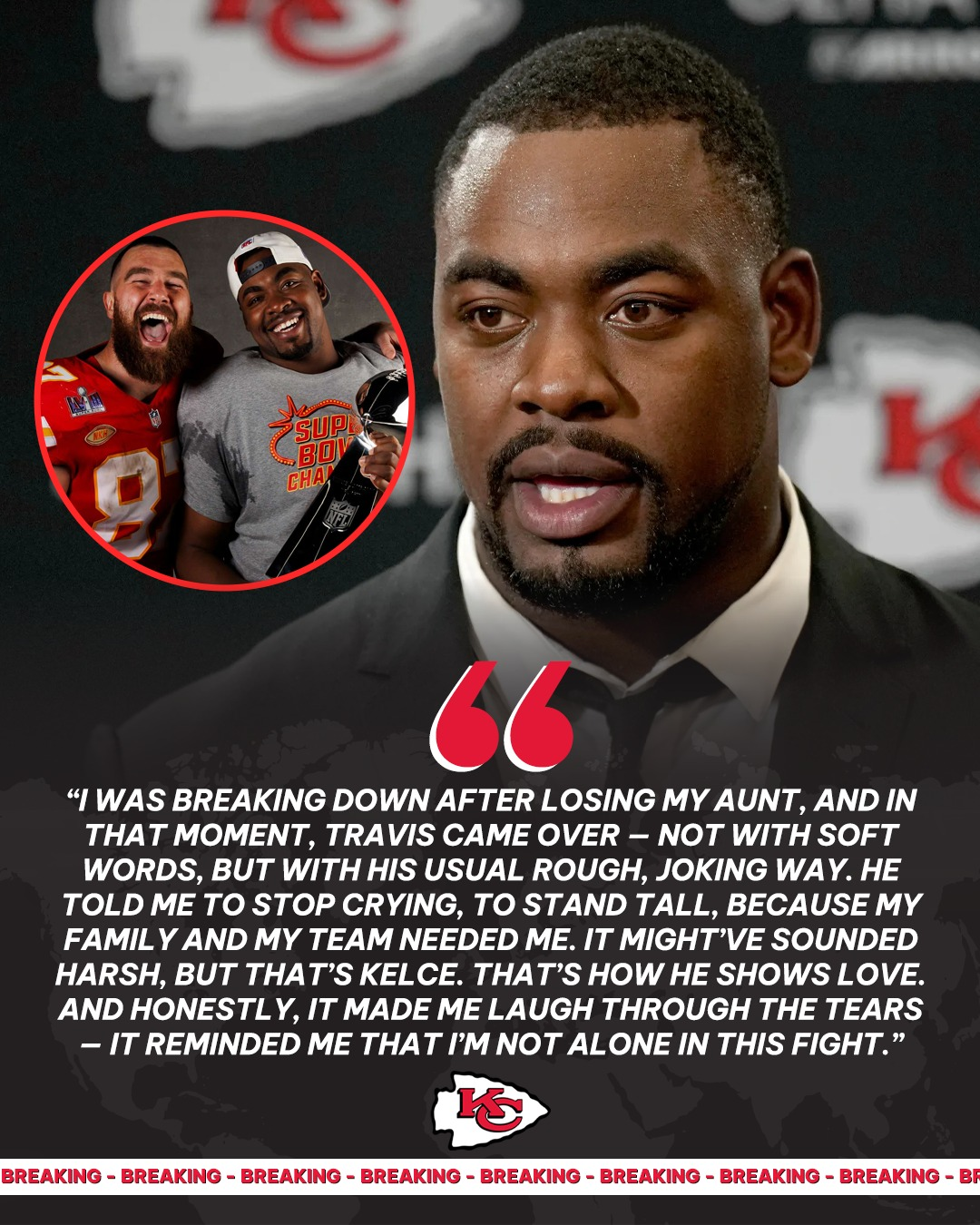 “I was breaking down after losing my aunt, and in that moment, Travis came over — not with soft words, but with his usual rough, joking way. He told me to stop crying, to stand tall, because my family and my team needed me. It might’ve sounded harsh, but that’s Kelce. That’s how he shows love. And honestly, it made me laugh through the tears — it reminded me that I’m not alone in this fight.” — Chris Jones