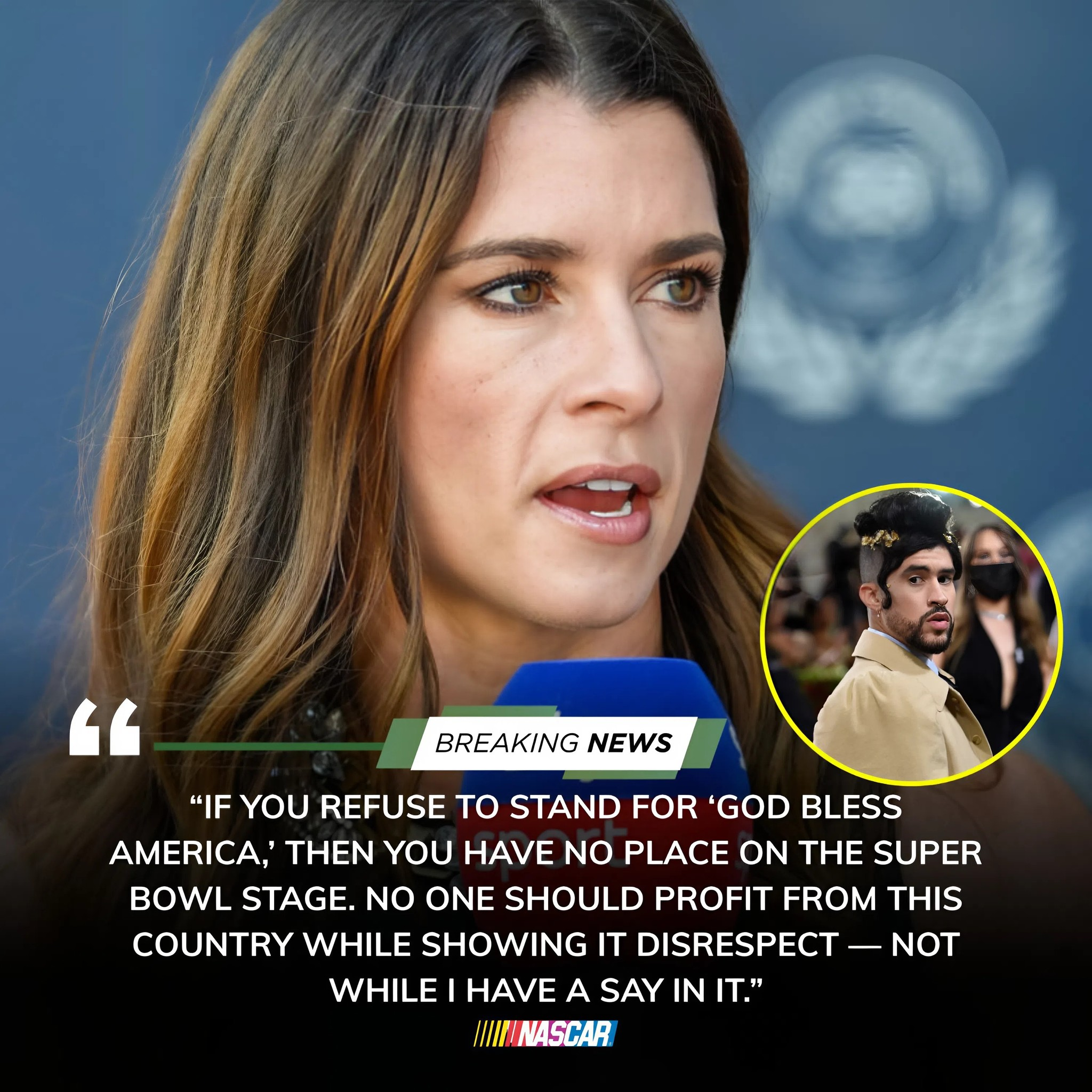 Danica Patrick, the legendary icon of NASCAR racing, shocked the entire United States and the sports community with her shocking statement about Bad Bunny, the world-famous Latin music star, after the event at Yankee Stadium. As Bad Bunny sat still during the emotional performance of “God Bless America,” Danica did not hesitate to express her deep indignation. Her decisive statement: “If you can’t stand up for America, don’t even dream of performing at the Super Bowl!” created a fierce debate.