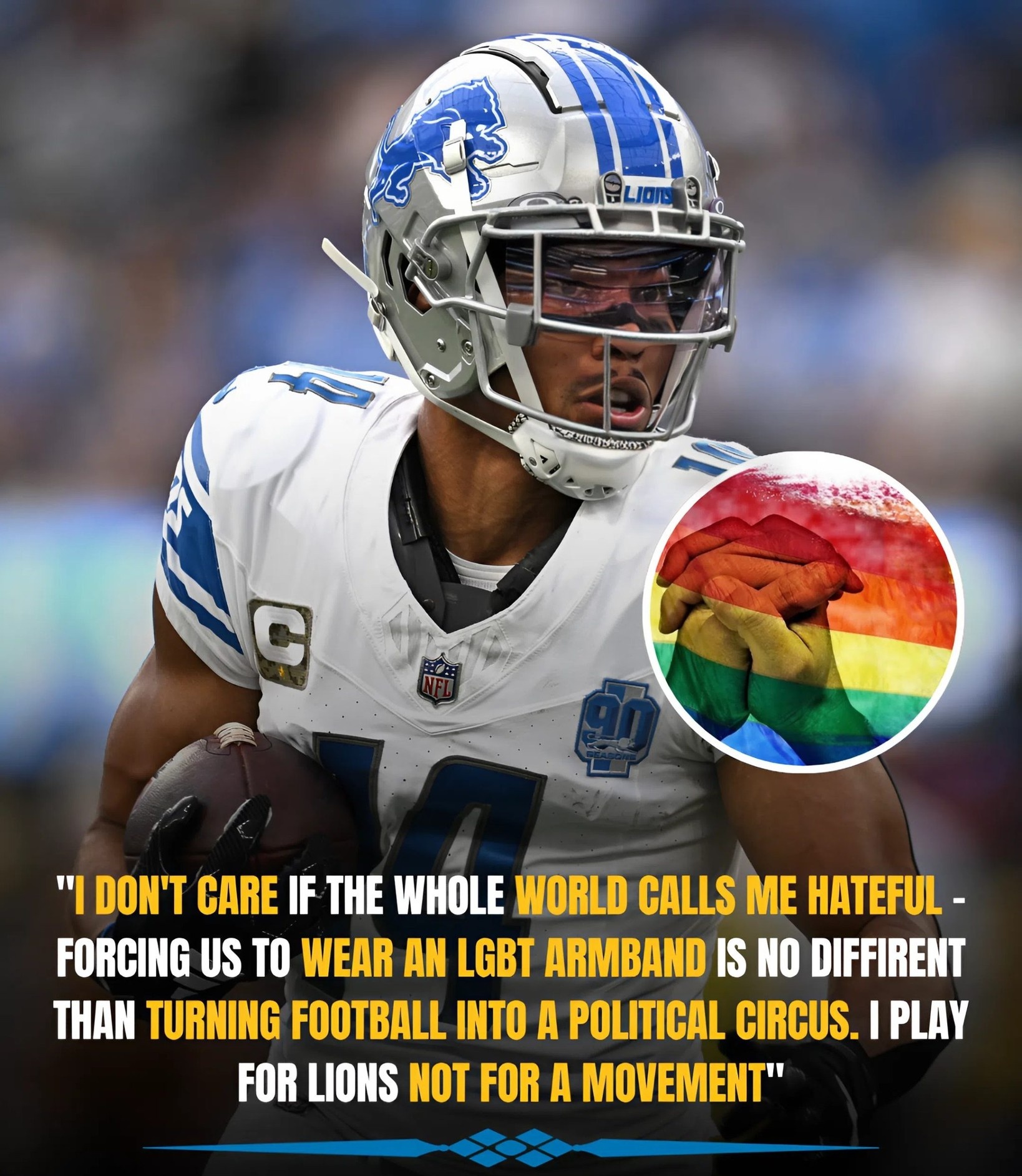 Detroit Lions wide receiver Amon-Ra St. Brown has always been a man who plays — and speaks — with conviction. The Pro Bowl playmaker, known for his work ethic, family-first mentality, and relentless drive, stunned the league this week when he reportedly refused to wear the NFL’s newly introduced LGBT armband, a symbol meant to honor inclusion and equality during the league’s “Together as One” campaign. While most players quietly complied, St. Brown’s decision to abstain — and his blunt remark that followed — transformed a small pregame detail into a national flashpoint. “I’m here to play football, not politics,” he told local reporters. “Respect doesn’t need to come with a hashtag.” Within hours, those words rippled across every sports desk in America. Some praised his courage to speak authentically. Others condemned him for rejecting what they saw as a simple gesture of solidarity. But for St. Brown, who has built his brand on discipline and personal faith rather than social theater, the move was entirely in character — calculated, confident, and utterly unapologetic.