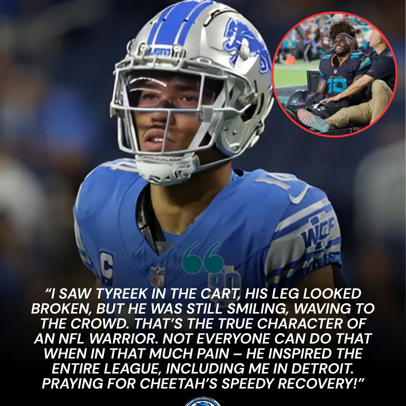 Enter Amon-Ra St. Brown, the Detroit Lions’ two-time Pro Bowl wide receiver and one of the league’s most respected young stars. Just minutes after the cart rolled off the field, St. Brown took to X (formerly Twitter) and his post-game podcast appearance on “The Gridiron Files,” delivering an emotional tribute that transcended divisional rivalries. “Seeing Tyreek on that cart, leg bent like it shouldn’t be—man, my heart dropped,” St. Brown said, his voice cracking with empathy. “But then I saw him smile through the pain, waving like he was just taking a breather. That’s not just bravery; that’s the soul of what makes NFL legends. Cheetah’s got that fire—reminds me why I grind every day. Prayers up, brother. The league needs you back terrorizing defenses.”